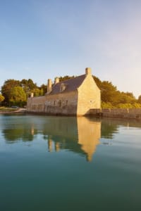 Construit au début du XIIe siècle ce moulin à marée situé sur la commune d’Arzon dans le golfe du Morbihan était très certainement une propriété seigneuriale. Cette conclusion vient du soin apporté à sa construction et la quantité inhabituelle de décorationsque l’on retrouve sur le moulin comme les frontons des lucarnes, la série de modillons en façade et les sculptures des cheminées.